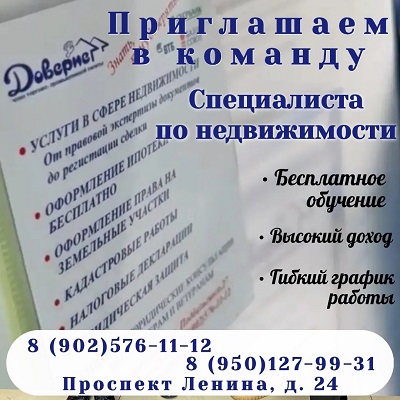 Приглашаем присоединиться к команде агентства недвижимости «Доверие» специалиста по недвижимости
